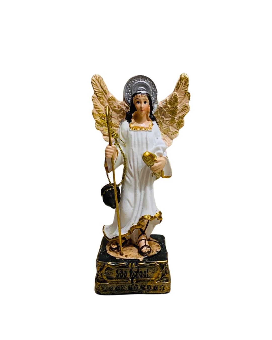 Esta imagem de São Rafael Arcanjo é confeccionada em resina de alta qualidade, com pintura artesanal e acabamento detalhado, destacando suas vestes, asas e o bastão com o peixe — símbolo da missão de cura e auxílio.