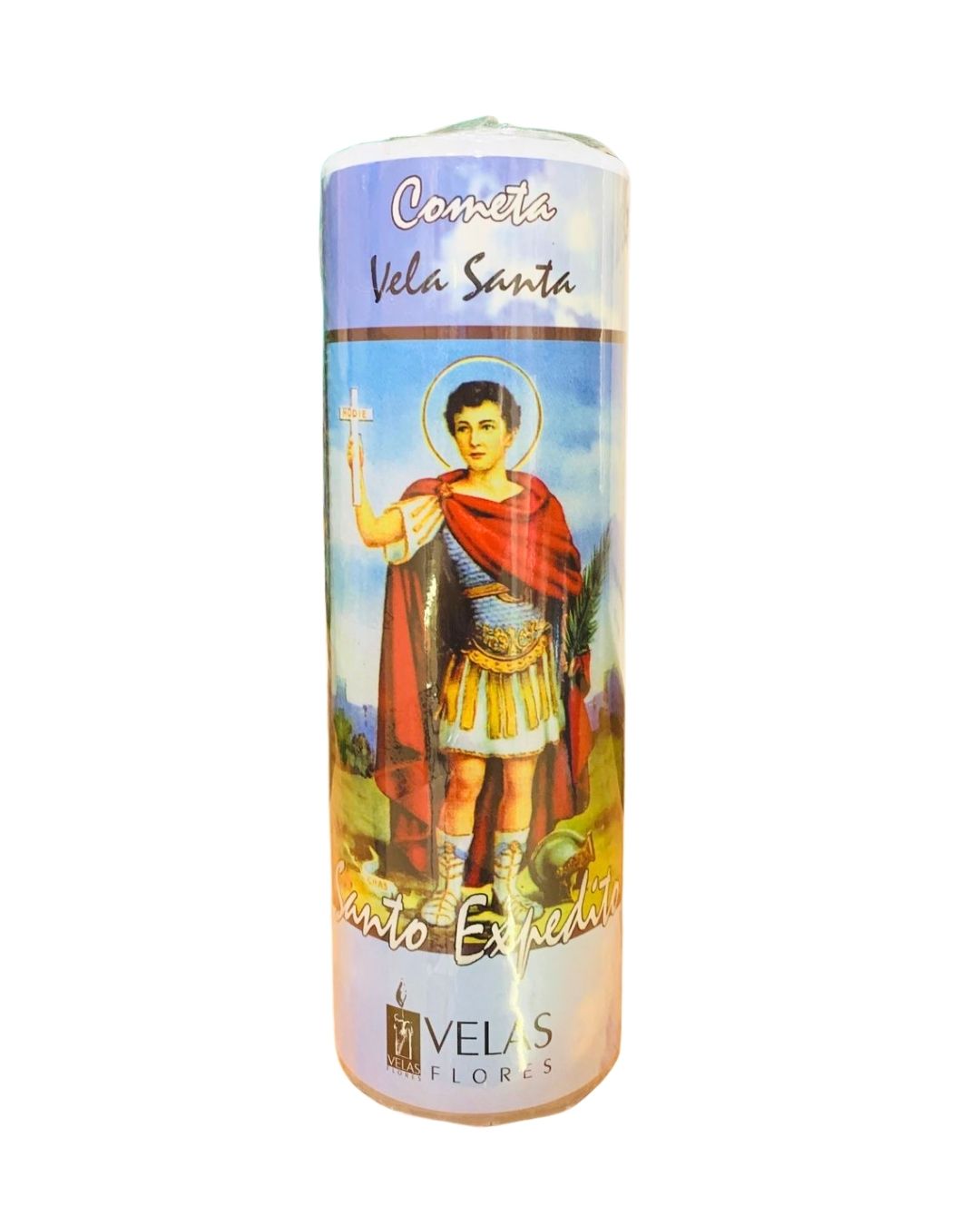 A vela traz a imagem de Santo Expedito e, no verso, a oração dedicada ao santo, permitindo que o devoto realize seu pedido com fé, constância e conexão espiritual durante todo o período de queima.