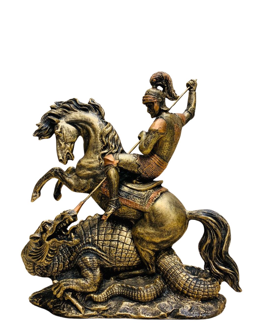 Imagem de São Jorge, símbolo de fé, coragem e proteção. Representado em sua luta contra o dragão, inspira força para vencer batalhas, abrir caminhos e afastar energias negativas. Um verdadeiro amuleto de devoção e confiança espiritual. peça imponente e cheia de detalhes que transmite força e elegância