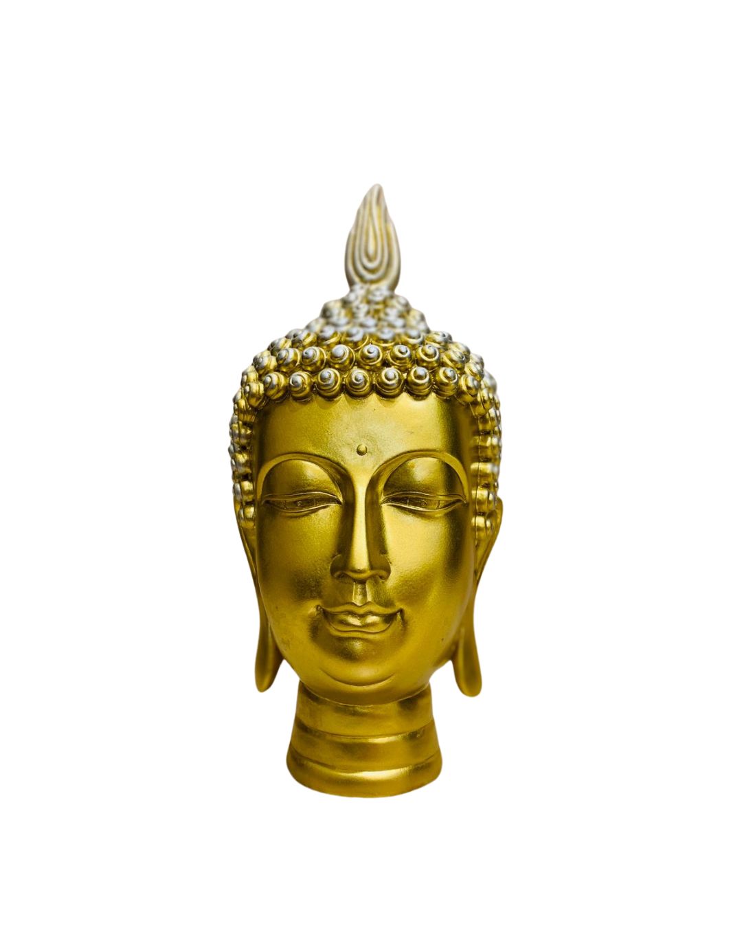 Escultura cabeça de Buda Tibetano dourado, símbolo de paz, equilíbrio e iluminação espiritual. Ideal para ambientes de meditação, decoração com significado ou para presentear com boas energias. Sua presença transmite serenidade, harmonia e proteção ao espaço.