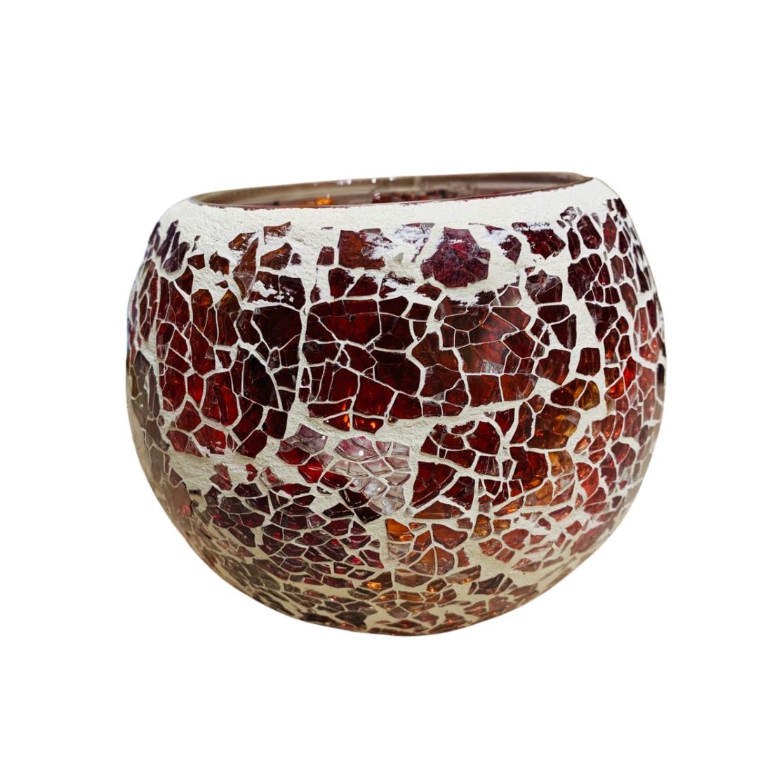Um charme para qualquer ambiente! Este porta-vela artesanal é feito em vidro com acabamento craquelado em tons de vermelho, amarelo, laranja e branco, criando um efeito único de mosaico que reflete a luz da chama com delicadeza e elegância.