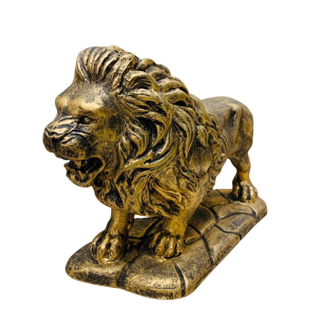 A majestosa estátua de leão dourado simboliza coragem, liderança e poder de proteção. Com acabamento envelhecido em tom dourado, transmite imponência e sofisticação, tornando-se uma peça perfeita para decorar ambientes internos ou externos.