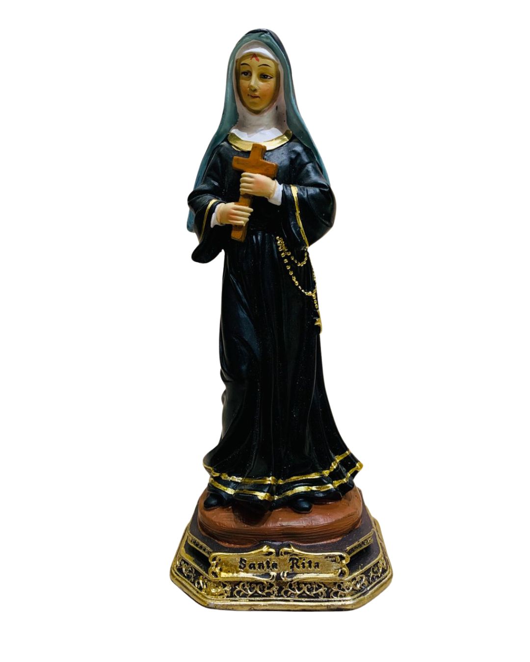 Imagem de Santa Rita de Cássia confeccionada em resina, colorida. Conhecida como a Santa das Causas Impossíveis, Santa Rita é símbolo de fé, perseverança e intercessão. Uma peça de devoção e espiritualidade, ideal para altares, oratórios, espaços de oração ou como presente especial de bênçãos e esperança.